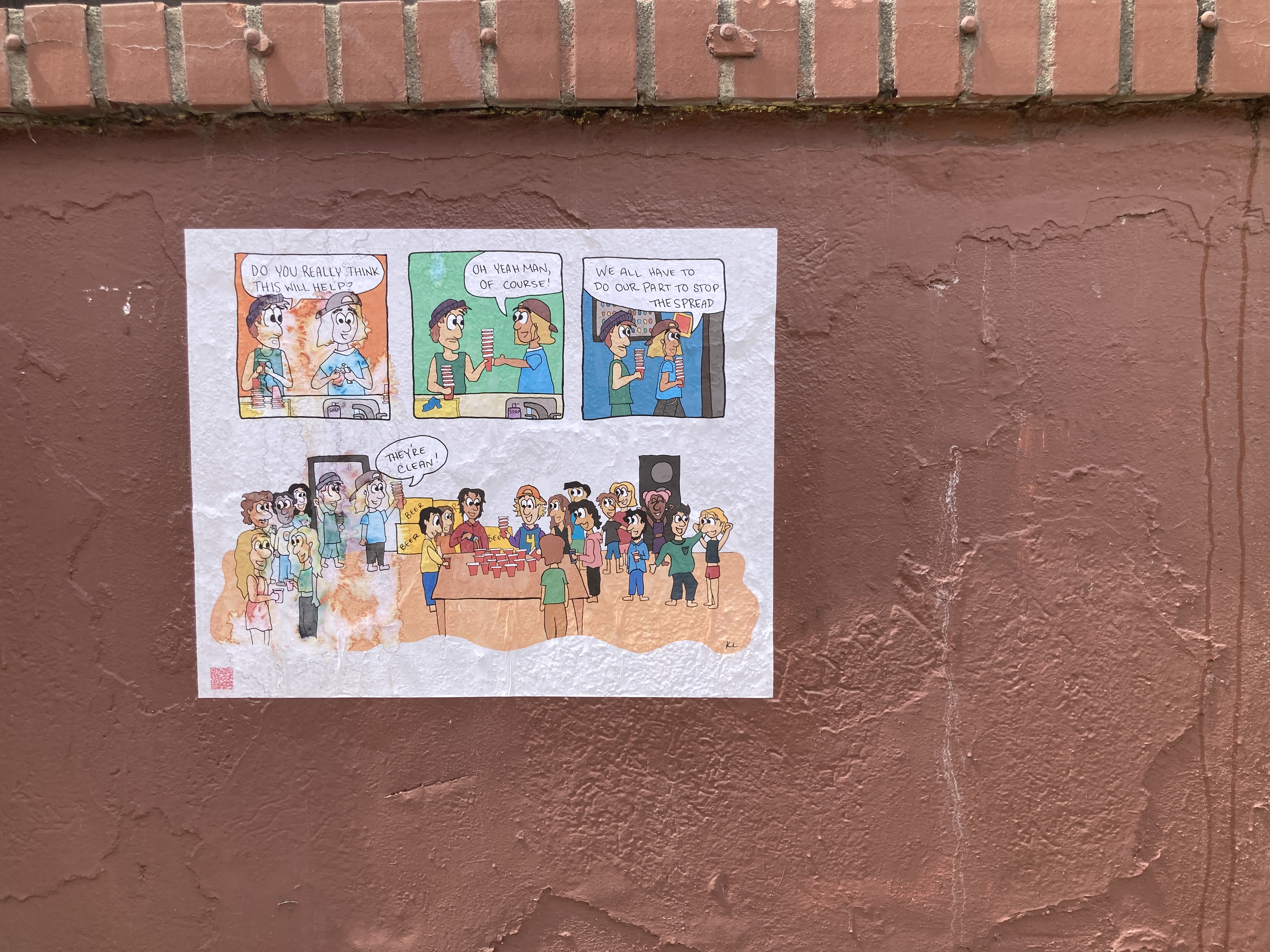 9 comics, hand-drawn and inked, digitally colored, then printed on various sizes and posted with wheat paste or hung inside windows on the streets of Boulder (the locations as found on the map). Several local businesses offered their walls or windows, other pieces were posted in a more “uncommissioned” capacity.